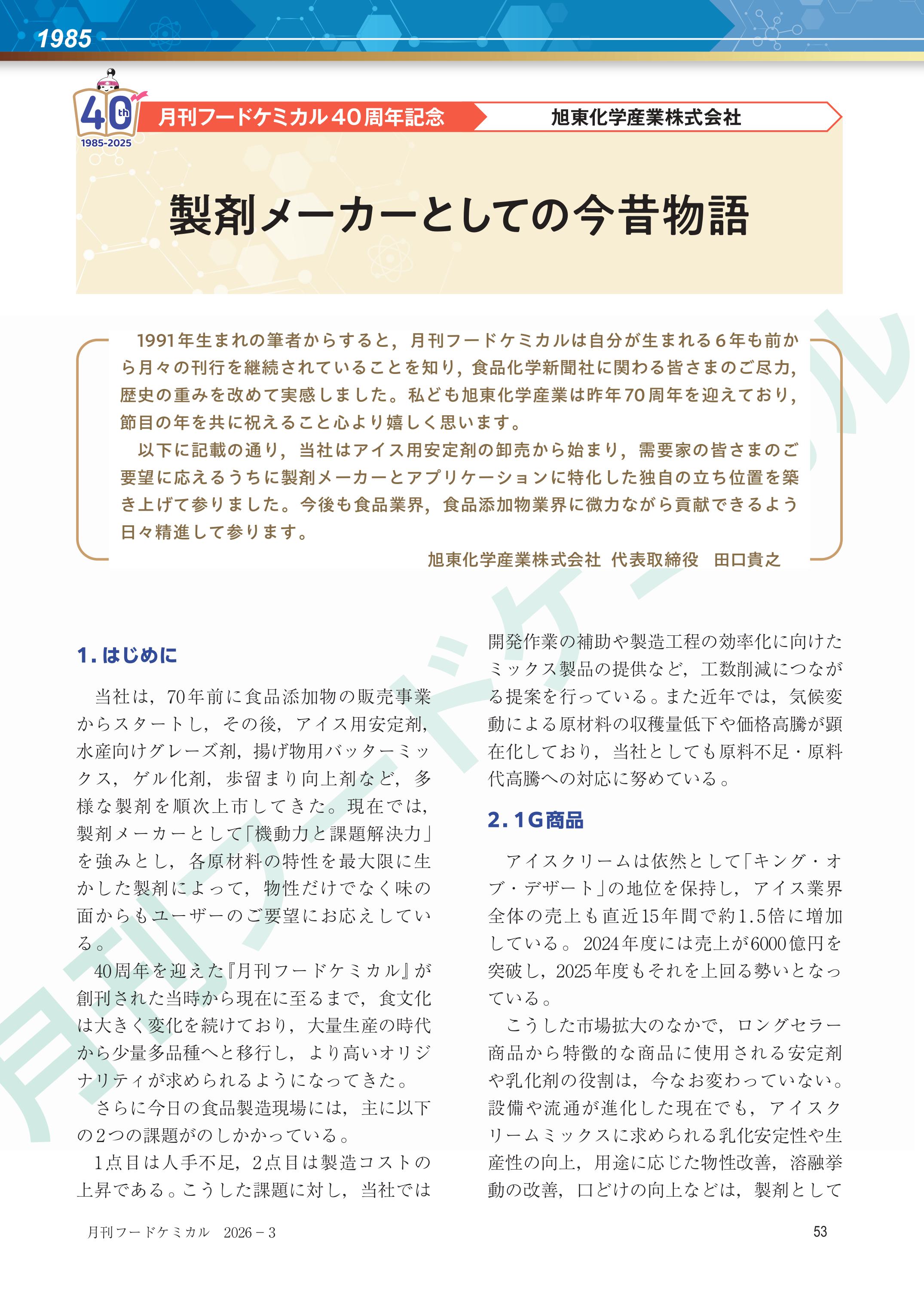 このたび、旭東化学産業は食品業界専門誌『月刊フードケミカル』(2026年3月号)に、同誌40周年記念の寄稿をいたしました。